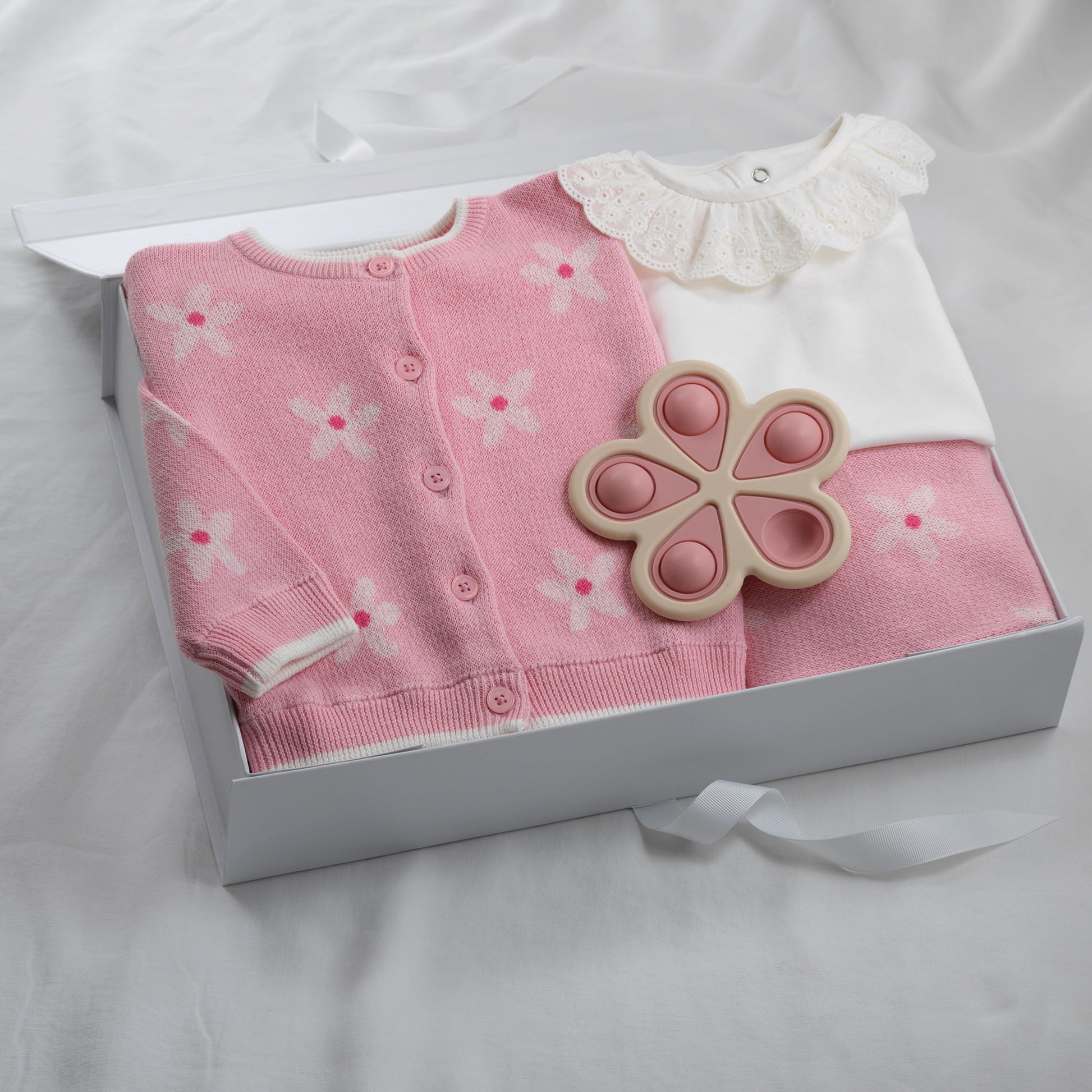 Our logo giftbox filled with a cardigan and knit legging set for baby girl, flower teething toy, and broderiie collar bodysuit.