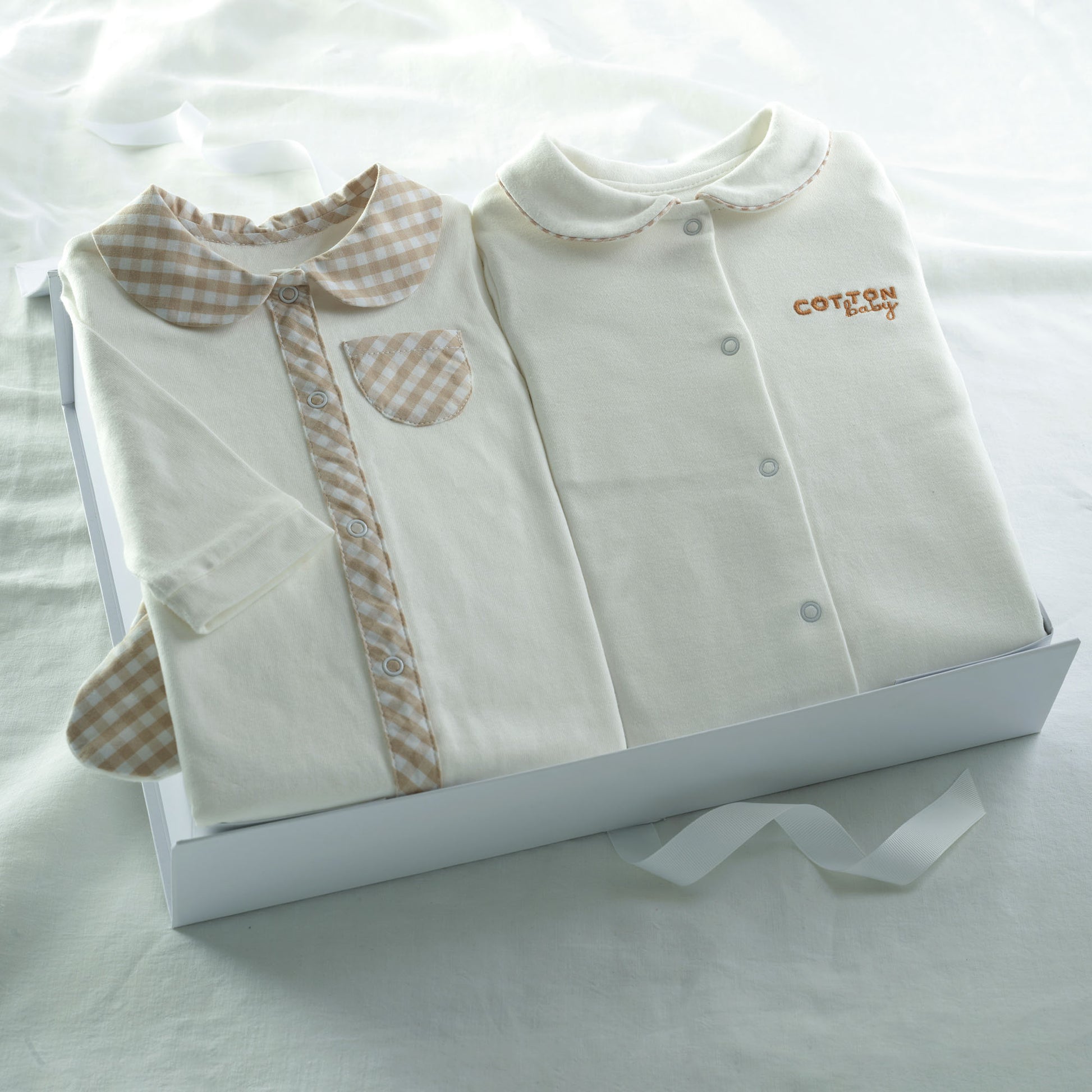 Neutral New Arrivals! Our logo giftbox filled with a gingham collar babygro and logo embroidered babygro. The perfect gift for when you're waiting to find out the gender.