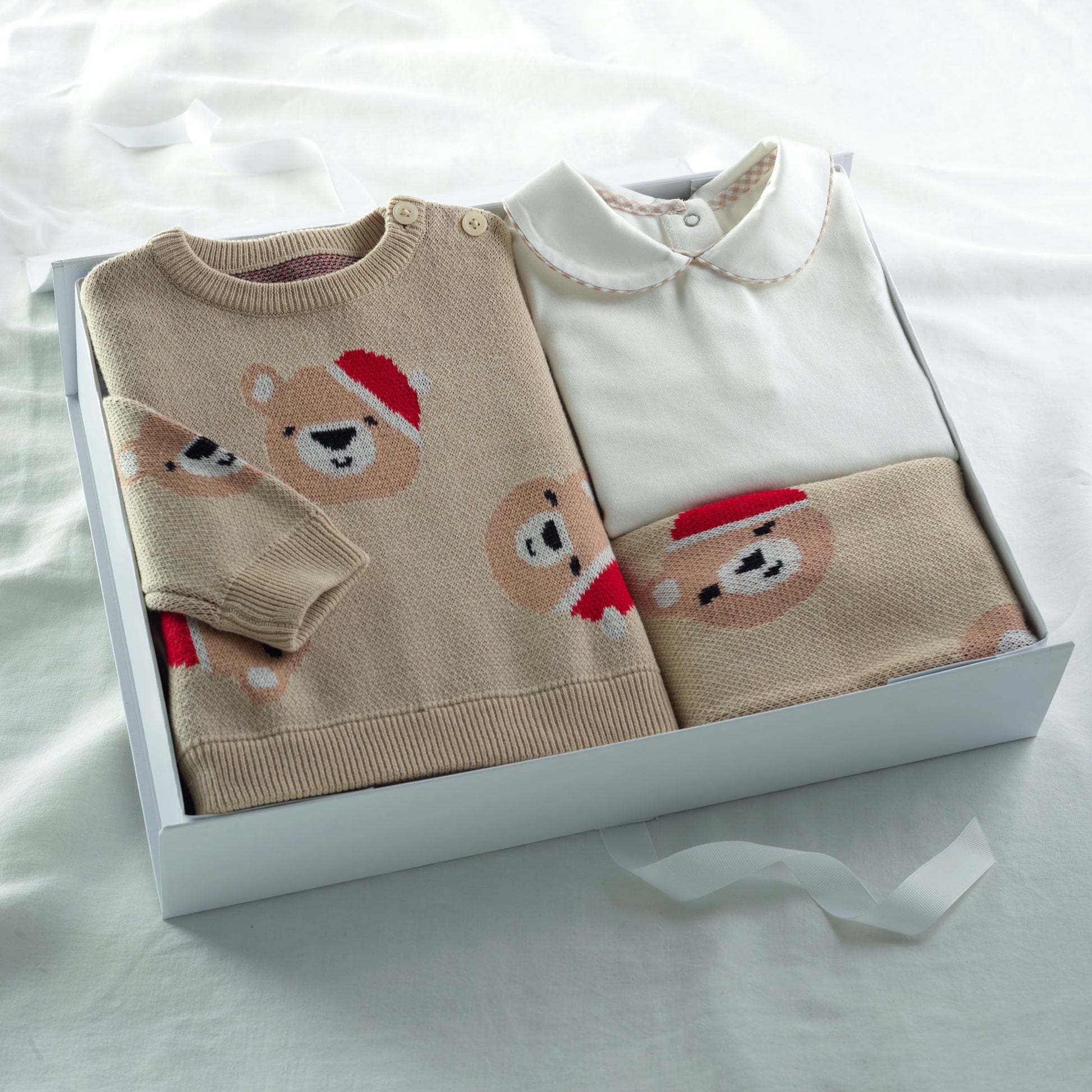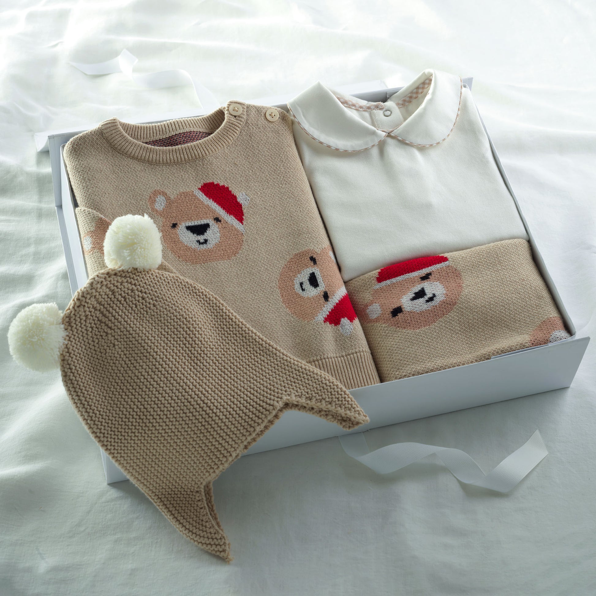 Celebrating Baby's First Christmas? Our logo giftbox is filled with a Santa Teddy sweater and knit legging set for baby, gingham collar bodysuit and pom pom knit hat. A perfect festive choice!