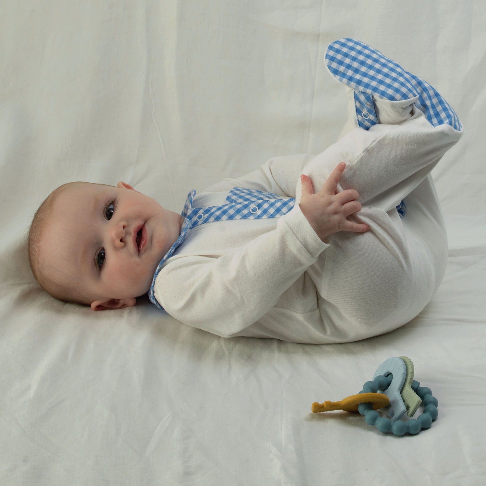 Our logo giftbox filled with a gingham collar babygro, snowflake knit blanket and silicone key teether.